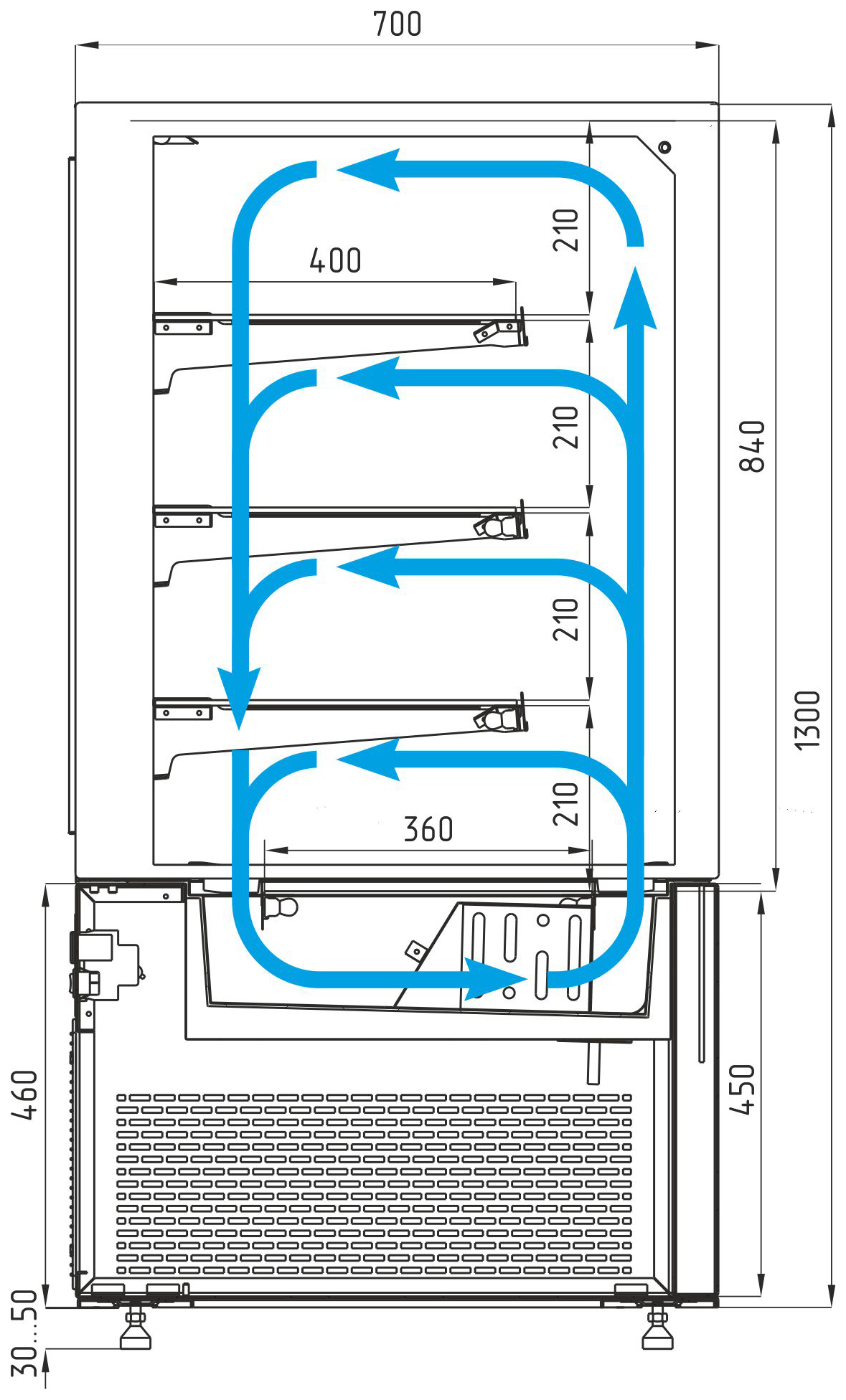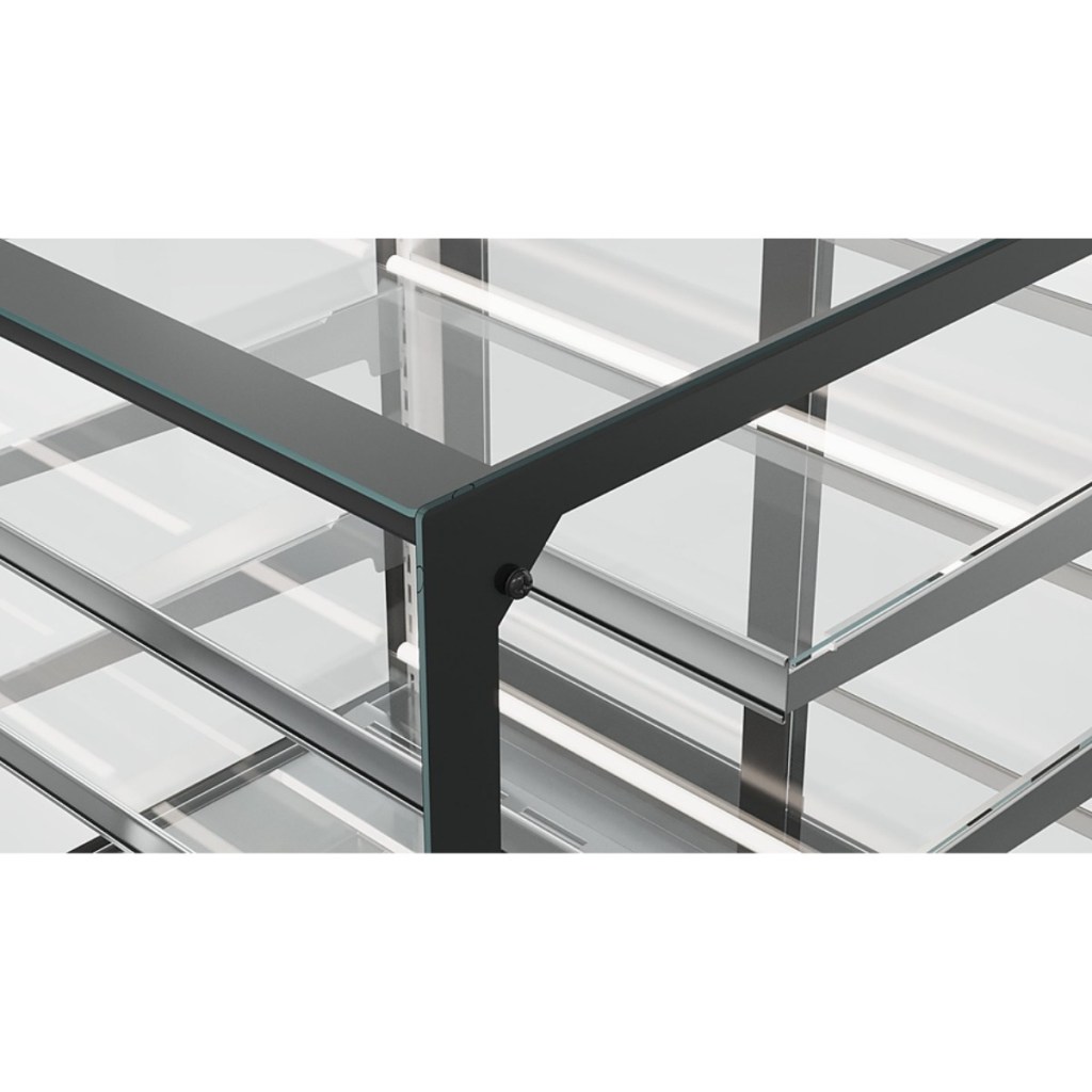 Корпус витрины выполнен из стали и пластика, внутренние полки — из прочного стекла, а зона выкладки оформлена матовым стеклом, что подчёркивает чистоту и стильность оформления.