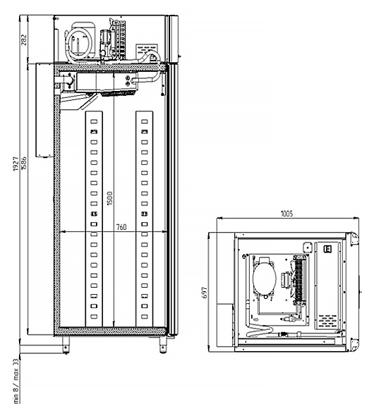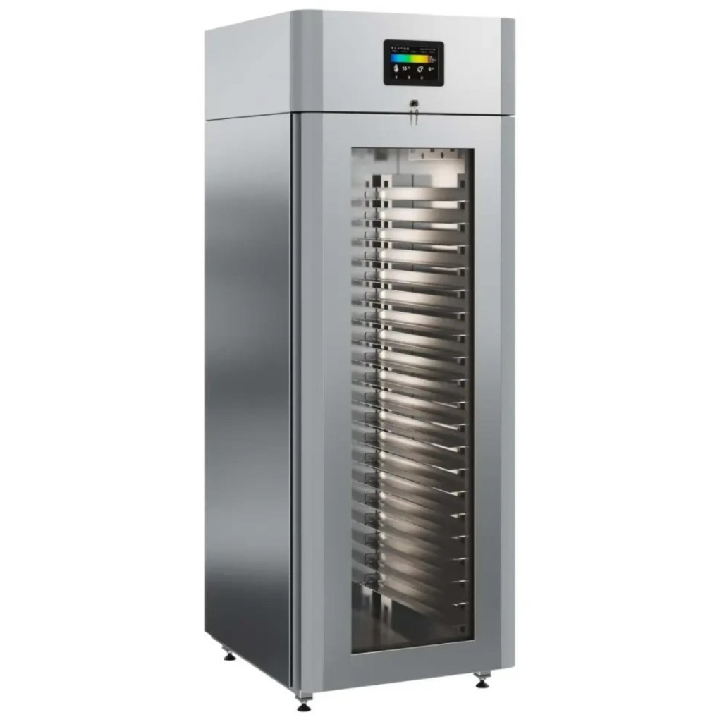 Каталог оборудования Холодильное оборудованиеШкафы холодильныеСпециализированные холодильные шкафыШкаф холодильный для хлебопекарных производств Polair CS107-Bakery Br со стеклом (Тип 1) Шкаф холодильный для хлебопекарных производств Polair CS107-Bakery Br со стеклом (Тип 1) Код товара: 062-622 Поделиться: WhatsAppTelegram СравнитьДобавить в КПВ избранное 0 414 545 ₽ В корзину 0 шт Под заказСамовывоз сегодня бесплатно Взять в кредит Купить в лизинг Получить консультацию в WhatsApp Описание Характеристики Отзывы 0 Инструкции 5 Шкаф холодильный для хлебопекарных производств Polair CS107-Bakery Br со стеклом (Тип 1) предназначен для создания оптимальных условий хранения и расстойки заготовок из теста на предприятиях общественного питания и торговли. Цельнозаливной корпус выполнен из нержавеющей стали, дверь — стеклопакет. Оборудование стабильно работает при температуре окружающей среды до +40 °C. В комплект входят 20 пар направляющих размером 400×600 мм. Особенности: Широкий функционал: охлаждение, замедление ферментации, хранение, регенерация, брожение и расстойка Динамическое охлаждение с мягким обдувом без заветривания и автоматическая оттайка с системой испарения конденсата Панель управления с 5" дисплеем: контроль температуры, влажности (регулируется от 60 до 95 %), скорости вентилятора и времени, а также возможность создания и сохранения программ Встроенный ультразвуковой увлажнитель (необходима система водоочистки и канализация) Эргономичная конструкция: верхнее расположение агрегата, распашная дверь со стеклопакетом, механизм самозакрывания, педаль для открытия, съёмные направляющие и легко заменяемый уплотнитель с магнитной вставкой Дополнительная защита: пластиковый бордюр по периметру камеры для предотвращения повреждений от тележек Простота ухода: штампованное углубление в дне корпуса для сбора загрязнений Экологичный хладагент R290 и энергоэффективность: потребляемая мощность — 0,55 кВт (охлаждение), 0,9 кВт (нагрев) Толщина стенки корпуса — 43 мм Polair CS107-Bakery Br со стеклом (Тип 1) — надёжный и многофункциональный шкаф, который обеспечивает полное управление процессами брожения и расстойки теста. Современная система охлаждения и увлажнения, продуманная конструкция и удобное управление делают его оптимальным решением для пекарен и кондитерских, стремящихся к стабильному качеству и высокой производительности.Изображение товара, представленного на фото, может отличаться от его фактического вида. Показать все Габаритные размеры697×1005×1960 ммДиапазон рабочей температурыот -10 до +40 °CДлина697 ммШирина1005 ммВысота1960 ммОбъём700 лКол-во дверей1 Тип двериСтеклянная Уровень влажностиот 60 до 95 %Направляющие под EN 40*6020 Расстояние между направляющими60 ммХолодильный агрегатВстроенный Тип оттайкиАвтоматическая Тип охлажденияДинамический ПодсветкаЕсть ХладагентR290 Вес нетто180 кгБрендPolairВсе специализированные холодильные шкафы Из нержавейки Оставить отзыв Еще никто не оставил отзыв на этот товар Схема POLAIR CS107 Bakery Br.jpgИнструкция на POLAIR CS107 Bakery Br.pdfБрошюра на хлебопекарное оборудование POLAIR.pdfДекларация о соответствии.pdfСертификат соответствия.pdf Похожие товары Перейти в каталог Под заказ 419 900 ₽ Шкаф холодильный для хлебопекарных производств Polair CS107-Bakery Br со стеклом (Тип 2) Под заказ 391 000 ₽ Шкаф холодильный для вызревания сыра Polair CS107 Cheese полки нерж. Под заказ 385 475 ₽ Шкаф хо