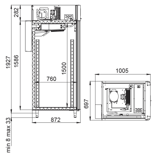 Каталог оборудования Холодильное оборудованиеШкафы холодильныеСпециализированные холодильные шкафыШкаф холодильный для вызревания салями Polair CS107 Salami со стеклом Шкаф холодильный для вызревания салями Polair CS107 Salami со стеклом Код товара: 062-631 Поделиться: WhatsAppTelegram СравнитьДобавить в КПВ избранное 0 385 050 ₽ В корзину 0 шт Под заказСамовывоз сегодня бесплатно Взять в кредит Купить в лизинг Получить консультацию в WhatsApp Описание Характеристики Отзывы 0 Инструкции 5 Шкаф холодильный для вызревания салями Polair CS107 Salami со стеклом предназначен для приготовления и хранения салями, сыровяленых колбас и других мясных деликатесов на предприятиях общественного питания и торговли. Корпус цельнозаливной конструкции выполнен из нержавеющей стали снаружи и внутри (кроме задней стенки), что обеспечивает высокую прочность и долговечность. Дверь выполнена в виде стеклопакета для удобного визуального контроля. Оборудование рассчитано на работу при температуре окружающей среды до +40 °С. Особенности: Динамическое охлаждение с мягким обдувом без заветривания Верхнее расположение агрегата Автоматическая оттайка с системой испарения конденсата Русифицированная многофункциональная панель управления с дисплеем 5" и возможностью создания и сохранения собственных программ Встроенный ультразвуковой увлажнитель (необходима подача очищенной воды и подключение к канализации) UV-лампа для обеззараживания воздуха внутри камеры 3 пары направляющих с тремя перекладинами и подвесами для колбас Регулируемый уровень влажности: от 60 до 95 % Распашная дверь с заливной теплоизоляцией, встроенной ручкой и магнитным уплотнителем Отключаемая внутренняя LED-подсветка Штампованное углубление в дне корпуса для удобства ухода Педаль для удобного открытия двери Хладагент R290 (пропан) Толщина стенки корпуса: 43 мм Polair CS107 Salami со стеклом — это профессиональный шкаф, разработанный специально для мясных деликатесов. Он обеспечивает оптимальные условия для ферментации и хранения продукции за счёт точного контроля температуры и влажности, продуманной конструкции и удобного функционала. Такой шкаф станет надёжным решением для мясных цехов, гастробаров и специализированных магазинов.Изображение товара, представленного на фото, может отличаться от его фактического вида. Показать все Габаритные размеры697×1005×1960 ммДиапазон рабочей температурыот -2 до +30 °CДлина697 ммШирина1005 ммВысота1960 ммОбъём700 лКол-во дверей1 Тип двериСтеклянная Уровень влажностиот 60 до 95 %Холодильный агрегатВстроенный Тип оттайкиАвтоматическая Тип охлажденияДинамическое ПодсветкаЕсть UV-лампаЕсть ХладагентR290 Вес нетто160 кгВес брутто190 кгБрендPolairВсе специализированные холодильные шкафы Из нержавейкиВсе специализированные холодильные шкафы Стеклянная дверь Оставить отзыв Еще никто не оставил отзыв на этот товар Схема POLAIR CS107 Salami.jpgИнструкция на POLAIR CS107 Salami.pdfБрошюра на POLAIR CS107 Salami.pdfДекларация о соответствии.pdfСертификат соответствия.pdf Похожие товары Перейти в каталог Под заказ 373 915 ₽ Шкаф холодильный для вызревания салями Polair CS107 Salami черный, со стеклом Под заказ 252 314 ₽ Шкаф холодильный для вызревания мяса и сыра Carboma M700GN-1-G-MHC 9005 Под заказ 389 300 ₽ Шкаф холодильный для вызревания мяса Polair CS107 Meat черный, со стеклом (Тип 1) Под заказ 419 900 ₽ Шкаф холодильный для хлебопекарных производств Polair CS107-Bakery Br со 