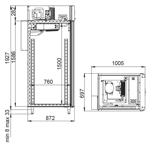 Каталог оборудования Холодильное оборудованиеШкафы холодильныеСпециализированные холодильные шкафыШкаф холодильный для вызревания сыра Polair CS107 Cheese полки нерж. Шкаф холодильный для вызревания сыра Polair CS107 Cheese полки нерж. Код товара: 062-628 Поделиться: WhatsAppTelegram СравнитьДобавить в КПВ избранное 0 391 000 ₽ В корзину 0 шт Под заказСамовывоз сегодня бесплатно Взять в кредит Купить в лизинг Получить консультацию в WhatsApp Описание Характеристики Отзывы 0 Инструкции 5 Шкаф холодильный для вызревания сыра Polair CS107 Cheese полки нерж. предназначен для создания оптимальных условий хранения и дозревания твердых и полутвердых сыров на предприятиях общественного питания и торговли. Монолитный цельнозаливной корпус выполнен из нержавеющей стали снаружи и изнутри (кроме задней стенки), что обеспечивает высокую механическую прочность и долговечность шкафа. Оборудование рассчитано на работу при температуре окружающей среды до 40 °С. Особенности: Верхнее расположение агрегата Многофункциональная русифицированная контрольная панель с 5-дюймовым дисплеем Возможность создания и сохранения собственных программ в памяти электронного блока Четыре перфорированные полки из нержавеющей стали Встроенный ультразвуковой увлажнитель (требуется подключение к системе подачи очищенной воды и централизованной канализации) Распашная дверь с заливной теплоизоляцией Заменяемый уплотнитель двери с магнитной вставкой Встроенная ручка для удобства открытия Отключаемая внутренняя LED-подсветка Штампованное углубление в дне корпуса для облегчения ухода Надежный замок Педаль для бесконтактного открывания двери Регулировка уровня влажности от 60% до 95% Максимальная нагрузка на каждую полку — 40 кг Толщина стенок корпуса — 43 мм Polair CS107 Cheese полки нерж. — это современный и надежный холодильный шкаф, который обеспечивает идеальные условия для хранения и дозревания твердых и полутвердых сыров. Прочный корпус, точное управление влажностью и температурой, а также удобство эксплуатации делают его отличным решением для предприятий общественного питания и торговли, стремящихся сохранить качество и вкусовые свойства сырной продукции.Изображение товара, представленного на фото, может отличаться от его фактического вида. Показать все Габаритные размеры697×1005×1960 ммДиапазон рабочей температурыот -2 до +30 °CДлина697 ммШирина1005 ммВысота1960 ммОбъём700 лКол-во дверей1 Тип двериМеталлическая Количество полок4 штДопустимая нагрузка на полку40 кгУровень влажностиот 60 до 95 %Холодильный агрегатВстроенный Тип оттайкиАвтоматическая Тип охлажденияДинамическое ПодсветкаЕсть ХладагентR290 Вес нетто144 кгВес брутто171 кгБрендPolairВсе специализированные холодильные шкафы Из нержавейки Оставить отзыв Еще никто не оставил отзыв на этот товар Схема POLAIR CS107 Cheese.jpgИнструкция на POLAIR CS107 Cheese.pdfБрошюра на POLAIR CS107 Cheese.pdfДекларация о соответствии.pdfСертификат соответствия.pdf Похожие товары Перейти в каталог Под заказ 397 800 ₽ Шкаф холодильный для вызревания сыра Polair CS107 Cheese полки нерж., со стеклом Под заказ 373 915 ₽ Шкаф холодильный для вызревания салями Polair CS107 Salami черный, со стеклом Под заказ 389 300 ₽ Шкаф холодильный для вызревания мяса Polair CS107 Meat (Тип 1) Под заказ 399 500 ₽ Шкаф холодильный для вызревания мяса Polair CS107 Meat со стеклом (Тип 1) Под заказ 405 450 ₽ Шкаф холодильный для хлебопекарных производств Polair CS107