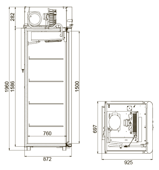Каталог оборудования Холодильное оборудованиеШкафы холодильныеШкафы холодильные универсальные от -5 до +5 °СШкаф холодильный универсальный Polair CV107-Gm Alu Шкаф холодильный универсальный Polair CV107-Gm Alu Код товара: 062-610 Поделиться: WhatsAppTelegram СравнитьДобавить в КПВ избранное 0 149 175 ₽ В корзину 0 шт Под заказСамовывоз сегодня бесплатно Взять в кредит Купить в лизинг Получить консультацию в WhatsApp Описание Характеристики Отзывы 0 Инструкции 4 Шкаф холодильный универсальный Polair CV107-Gm Alu предназначен для демонстрации и надежного хранения продуктов на предприятиях общественного питания и торговли. Корпус шкафа цельнозаливной, выполнен из прочной стали с полимерным покрытием, что гарантирует высокую механическую прочность и длительный срок службы. Алюминиевые профили дверей и верхней панели подчеркивают современный, премиальный дизайн. Оборудование эффективно работает при температуре окружающей среды до 40 °С и влажности воздуха до 80%. Особенности модели: Многофункциональная контрольная панель (терморегулятор) для удобного управления параметрами. Жидкокристаллический дисплей, обеспечивающий чёткое отображение настроек и информации о работе шкафа. Клапан Шредера для удобного обслуживания холодильного контура. Распашной тип двери для легкого доступа к продуктам. Возможность изменить сторону открывания двери (при наличии опции), что делает установку более универсальной. Полностью интегрированные в профили дверей ручки, подчеркивающие стильный внешний вид и удобство использования. Встроенная светодиодная подсветка для отличной видимости содержимого шкафа. Надежный замок для защиты продуктов. Педаль для удобного открывания двери без использования рук. Высокая допустимая нагрузка на полку — до 40 кг, что позволяет хранить большие объемы продукции. Размер полки: GN 2/1 (530×650 мм), подходит для стандартных гастроемкостей. Толщина стенки корпуса — 43 мм, обеспечивающая отличную теплоизоляцию и снижение энергопотерь. Polair CV107-Gm Alu — это функциональный и стильный холодильный шкаф, который сочетает надежность, эргономичный дизайн и удобство эксплуатации. Использование прочных материалов и продуманная конструкция делают его идеальным решением для профессиональной кухни или торгового зала.Изображение товара, представленного на фото, может отличаться от его фактического вида. Показать все Габаритные размеры697×925×1960 ммДиапазон рабочей температурыот -5 до +5 °CДлина697 ммГлубина925 ммВысота695 ммОбъём700 лРазмер полки530×650 ммКоличество полок4 штКоличество дверей1 штТип оттайкиАвтоматическая Тип охлажденияДинамическое Тип управленияЭлектронное Материал корпусаНержавеющая сталь Тип двериМеталлическая ЗамокЕсть Способ открыванияРаспашные ХладагентR290 Холодильный агрегатВстроенный Расположение агрегатаВерхнее Потребление электроэнергии в сутки4,5 кВтПотребляемая мощность0,4 кВтНапряжение220 ВГабариты в упаковке800×1000×2150 ммВес нетто115 кгВес брутто140 кгБрендPolairВсе шкафы холодильные универсальные от -5 до +5 °С Из нержавейки Оставить отзыв Еще никто не оставил отзыв на этот товар Схема POLAIR CV107-Gm Alu.jpgИнструкция на POLAIR CV107-Gm Alu.pdfДекларация о соответствии.pdfСертификат соответствия.pdf Похожие товары Перейти в каталог В наличии 133 000 ₽ Шкаф холодильный универсальный Север ШХ-1000 УН/ГЛ В наличии 140 675 ₽ Шкаф холодильный универсальный Polair CV 110-S В наличии 13