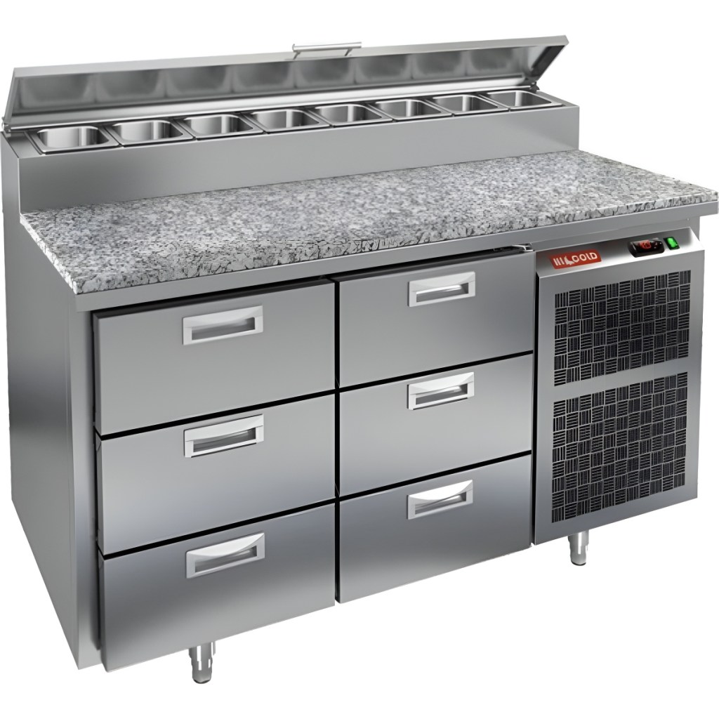 Стол холодильный для пиццы HiCold PZ2-33GN (1/6) камень предназначен для кухонь и предприятий общественного питания. Он используется для раскатки теста, подготовки ингредиентов для пиццы, салатов и других блюд, а также для охлаждения и кратковременного хранения скоропортящихся продуктов. Модель совмещает гранитную рабочую поверхность и охлаждаемый отсек с 6 выдвижными ящиками, обеспечивая удобный доступ к ингредиентам и эффективное хранение без дверей.